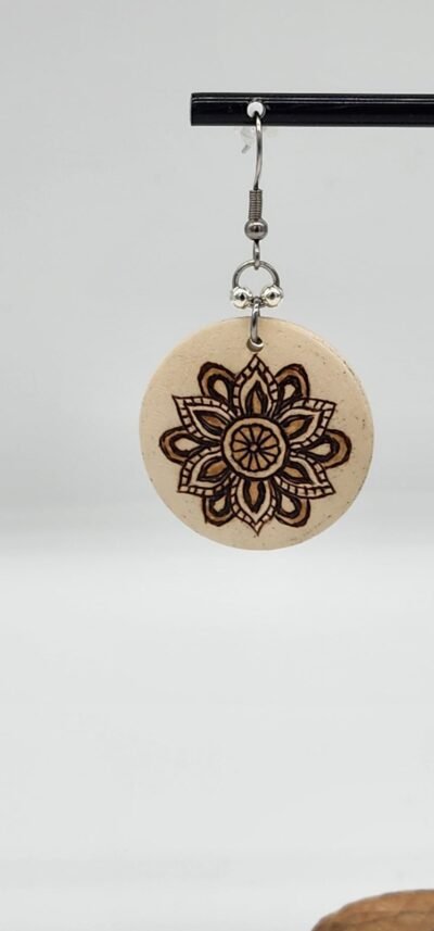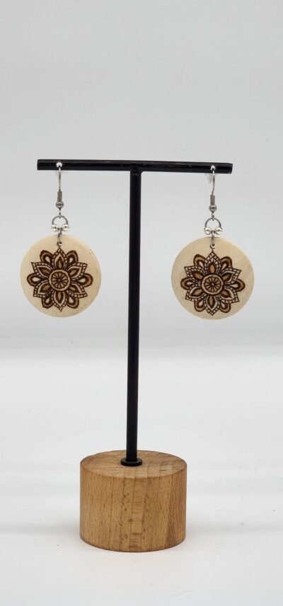 Ces boucles d’oreilles en bois de pin sont pyrogravées à la main, une à une, dans l’atelier Pyro’Art.
